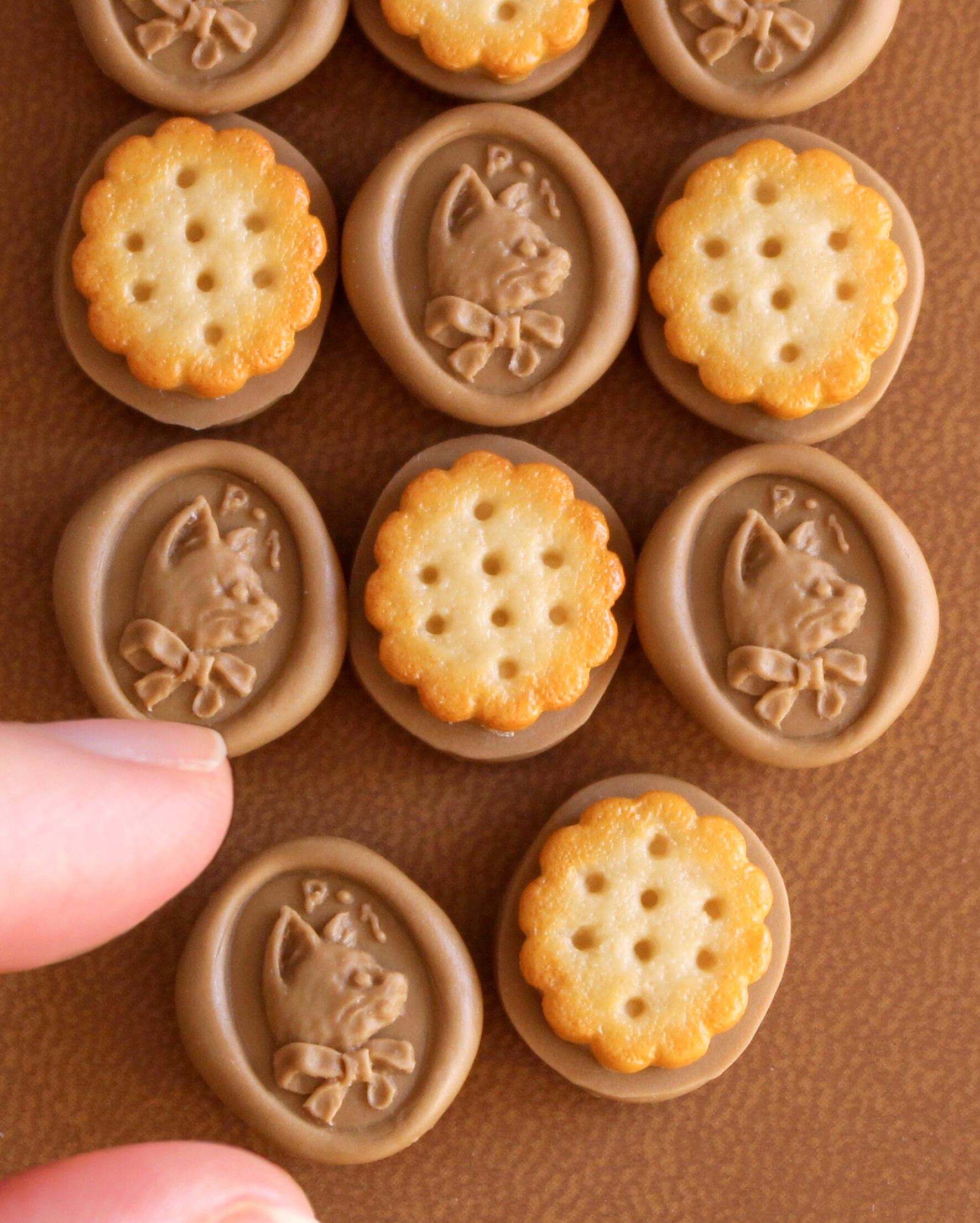 封蝋をイメージしたレリーフ状の猫ちゃんチョコと、香ばしい香りがしそうなビスケットを合体させたお菓子を作りました。